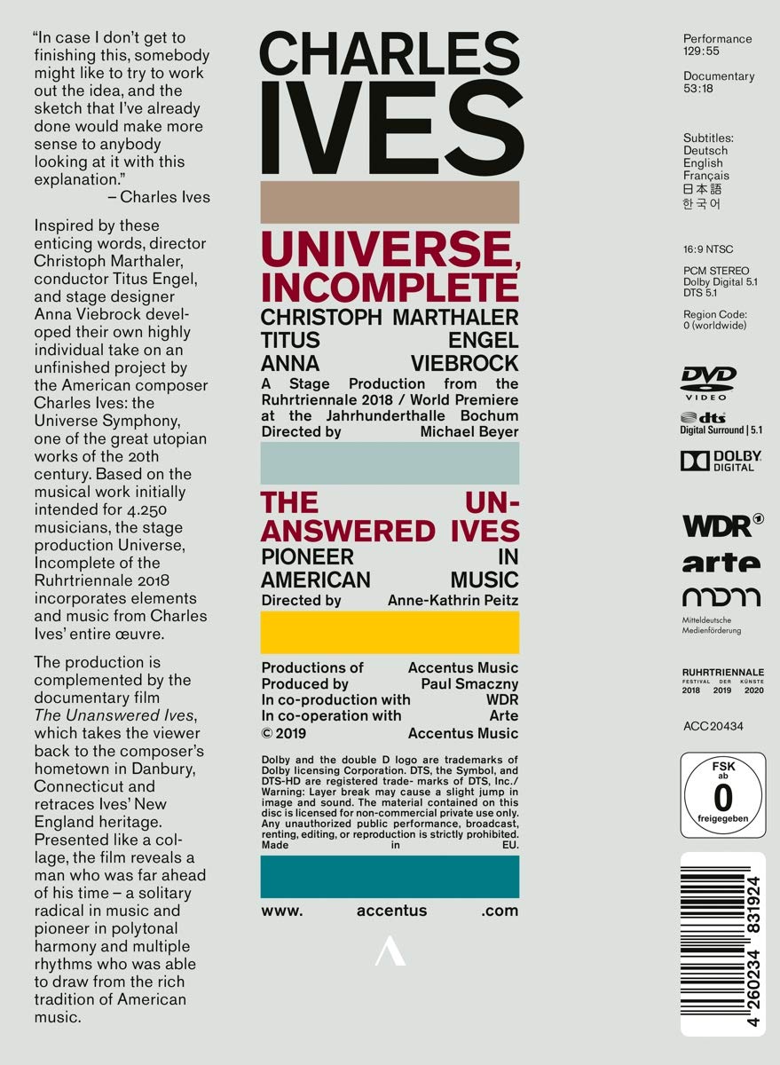 Když se mi do rukou dostal nový titul labelu Accentus, který je na dvou DVD discích kompletně zaměřen na dílo amerického skladatele Charlese Ivese (1874 až 1954), měl jsem vedle radosti z dokumentu jako takového i radost z možnosti poznat nastudování díla jménem Universe incomplete, které v roce 2018 v Bochumi nastudoval režisér Christoph Marthaler.