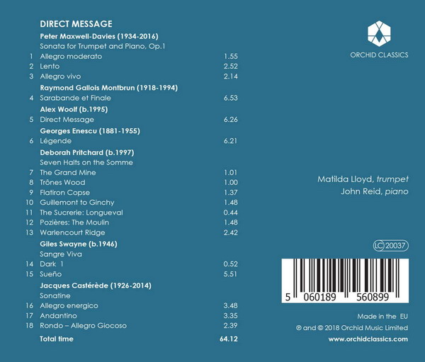Výrazným způsobem zapůsobí i op. 1 Petera Maxwella-Davise (1934-2016). Sonáta pro trubku a klavír je nositelkou velkého kompozičního mistrovství, které zúčastnění sólisté (ano, nazvěme je tak oba) hrají skutečně bravurně. Jacques Castérede žil v letech 1926 až 2014. I prostřednictvím nahrávky přítomné sonatiny, jež je životem protkanou skladbou, která si přímo říká o opakovaný poslech, však bude žít věčně. Nemůže se nelíbit Sarabanda a finále Raymonda Montbruna (1918-1994) a skladba Direct message, po které je pojmenováno samotné album a jež právě pro toto album vznikla. Jejím autorem je mladičký Alex Woolf (1995) a i jeho kompozici sama Matilda Lloyd velmi erudovaně ve svém průvodním bookletu popisuje a dokládá a doplňuje tím originalitu, objevnost a přitažlivost celému albu.