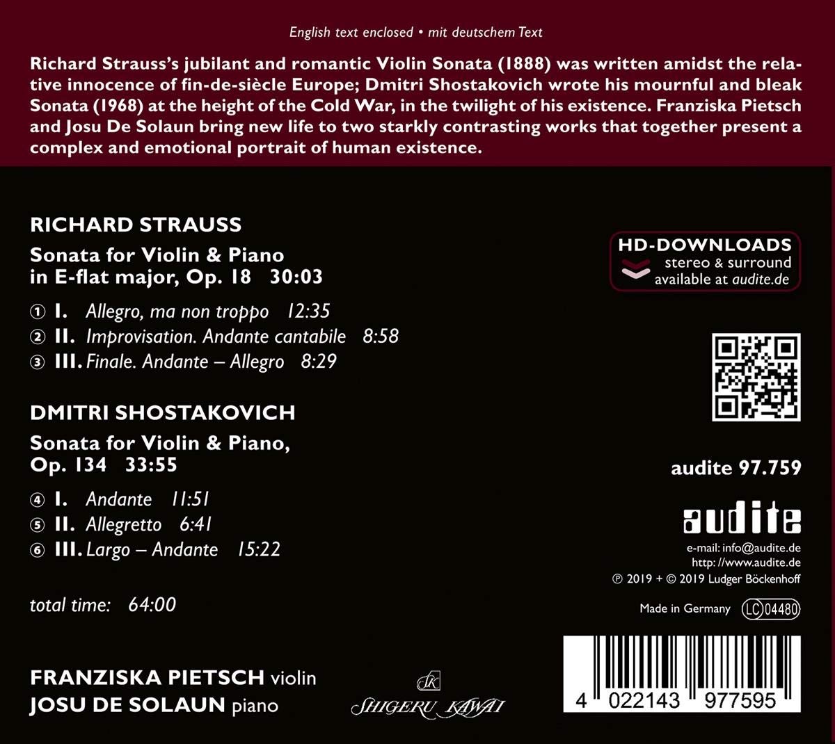 Skvostem tohoto alba je ovšem Šostakovičova sonáta pro housle a klavír op. 134 a skvostem je jak kompozičním (může aspirovat na jedno z nejvýznamnějších děl historie hudby vůbec), tak co se týká interpretace dua Pietsch a Solaun. Perfekce, kterou musíte slyšet a je možno slíbit, že pokud zavřete oči, budete ji i vidět.
