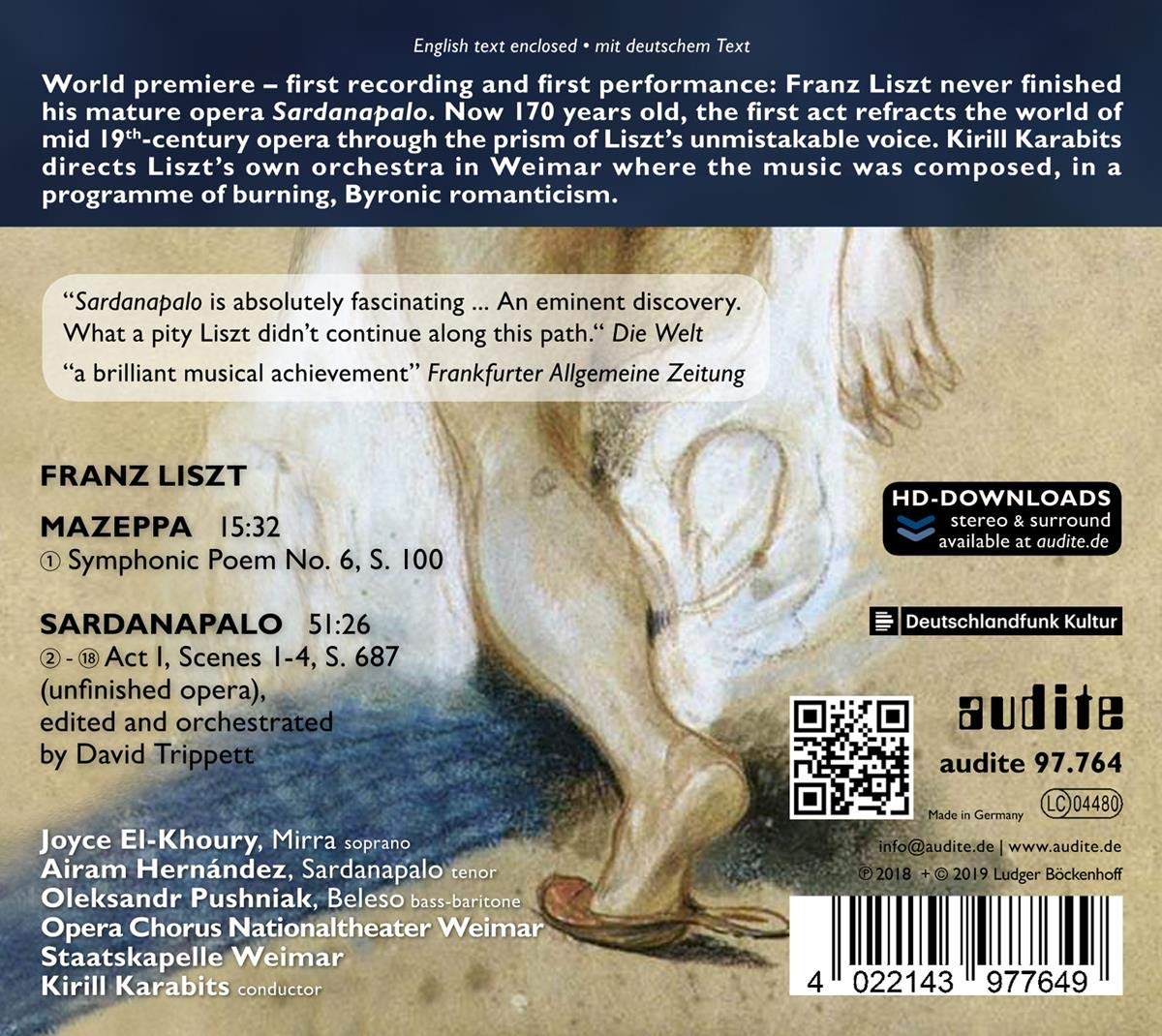 U audite umí vybrat titul, který zaujme. Zároveň pak takový, který nikdo jiný nemá. Řeč je o skladateli Ferenci Lisztovi, který se pustil do díla, jenž sice nedokončil, ale z ruky Davida Trippetta se mu dostalo takového stupně dokončení, že máme co dočinění s atraktivní orchestrální partiturou doplněnou a vynalézavé, náročné a posluchači k poslouchání příjemné vokální party. Párty s Lisztovou Staatskapelle Weimer a operou Sardanapalo tak může začít.